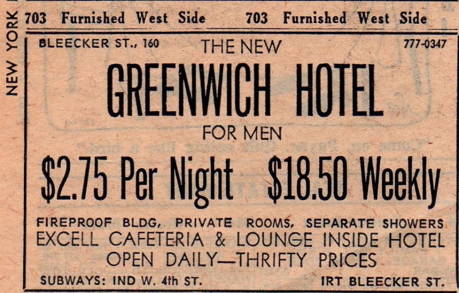 “When No. 1 was sold it became the Greenwich Hotel (for men), and by the 1960s it became the first hotel in New York to be called a ‘welfare hotel,’” noted Pape. A 1970 Village Voice article stated that 900 men lived in the Greenwich, which was the site of 17 robberies a day and massive lice infestation. (Hotel ad from the NY Post, December 1970)
