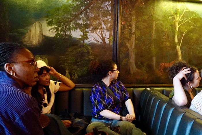 The audience for the Search Work reading took over green banquettes, backed by paintings by Nina Nichols.