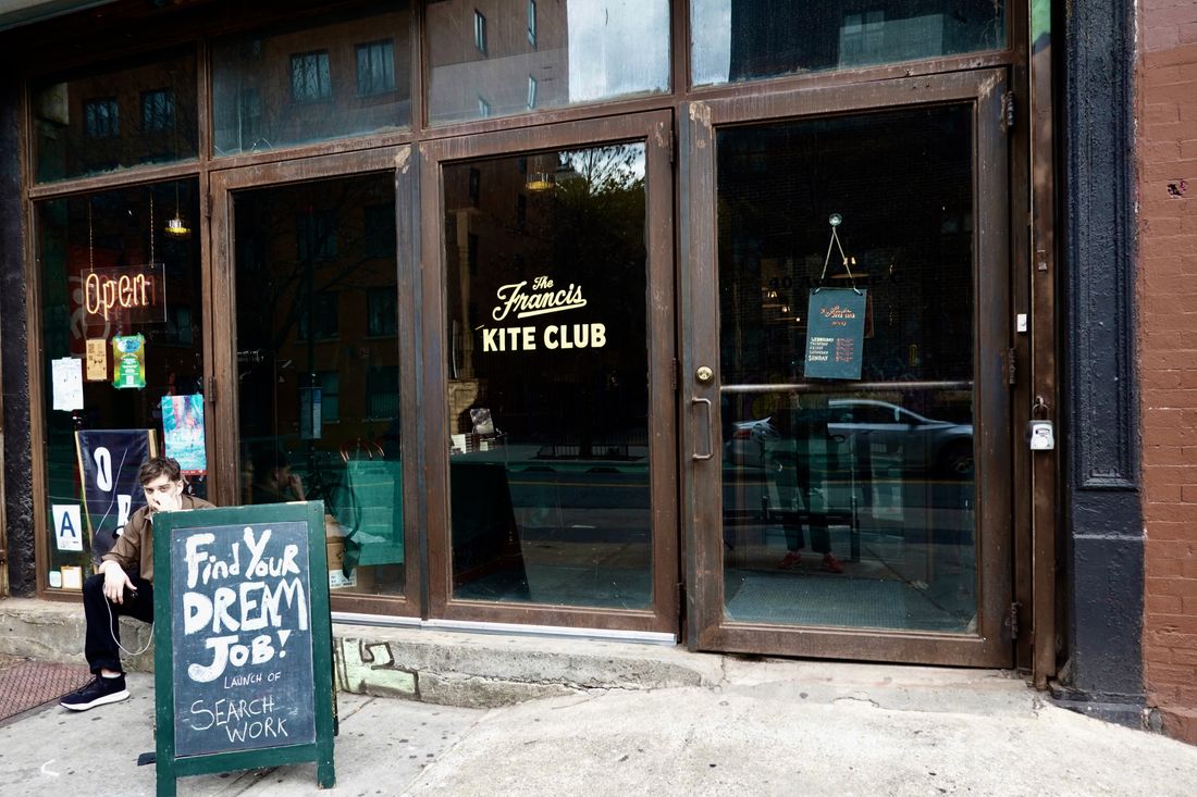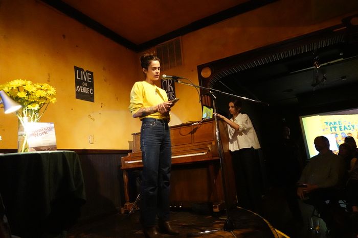 On a Wednesday in April, a chalkboard outside the Francis Kite Club on Avenue C read, “Find Your Dream Job!” Inside, on a low stage near the center of the room, in jeans and a loose yellow sweatshirt, Rachel Meade Smith was introducing a collection of essays, Search Work, as a 21st-century record of the maddening search for “meaningful, sustainable, and humane work.” Her editor at the small indie OR Books, Olivia Heffernan, pointed out the copies for sale to the audience filling out the bar’s dark-green banquettes and rows of folding chairs, then made an invitation: “Feel free to come check out our office,” she said, pointing to an arched door at the back of the bar.
