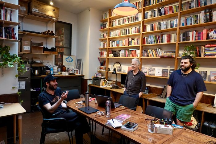 Sean Goldring, the bar manager, chats with Colin Robinson, the co-founder of OR Books, and Joey Daniel, who oversees audiobooks and multimedia.