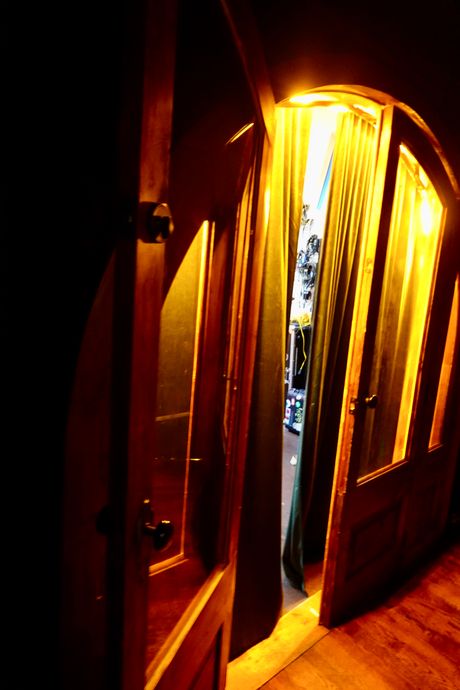 Through the arched door, editor Sam Russek works below a drum kit and a shelf of back issues of Lux Magazine. From top: Photo: Adriane QuinlanPhoto: Adriane Quinlan