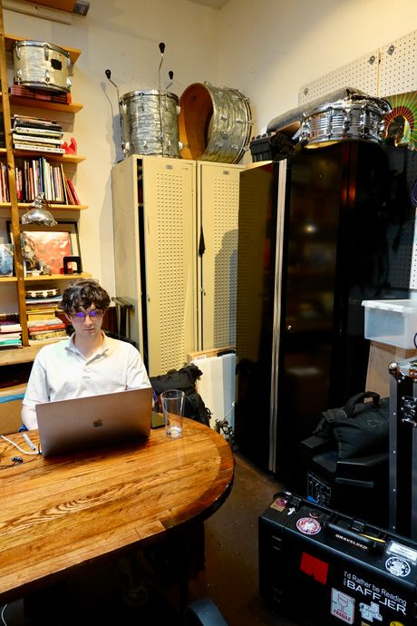 Through the arched door, editor Sam Russek works below a drum kit and a shelf of back issues of Lux Magazine. From top: Photo: Adriane QuinlanPhoto: A… more