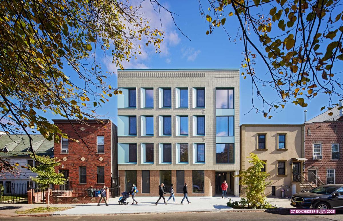 Along a transit-oriented corridor in Brooklyn, a design and development team is showing how to construct scattered-site, Missing Middle housing with context-sensitive architecture, and some buildings use single-stair construction. David Cunningham Architecture Planning won a 2026 Charter Award for Belle Gardens, which consists of seven four and five-story buildings along a 15-block corridor centered on Herkimer Street.