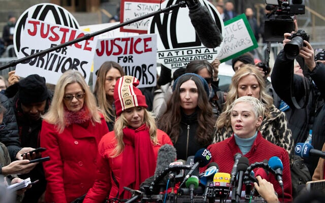 In this January 6, 2020, file photo, Actor Rose McGowan, right, speaks at a news conference as actor Rosanna Arquette, center left, listens outside a Manhattan courthouse after the arrival of Harvey Weinstein in New York. (AP Photo/Mark Lennihan, File)