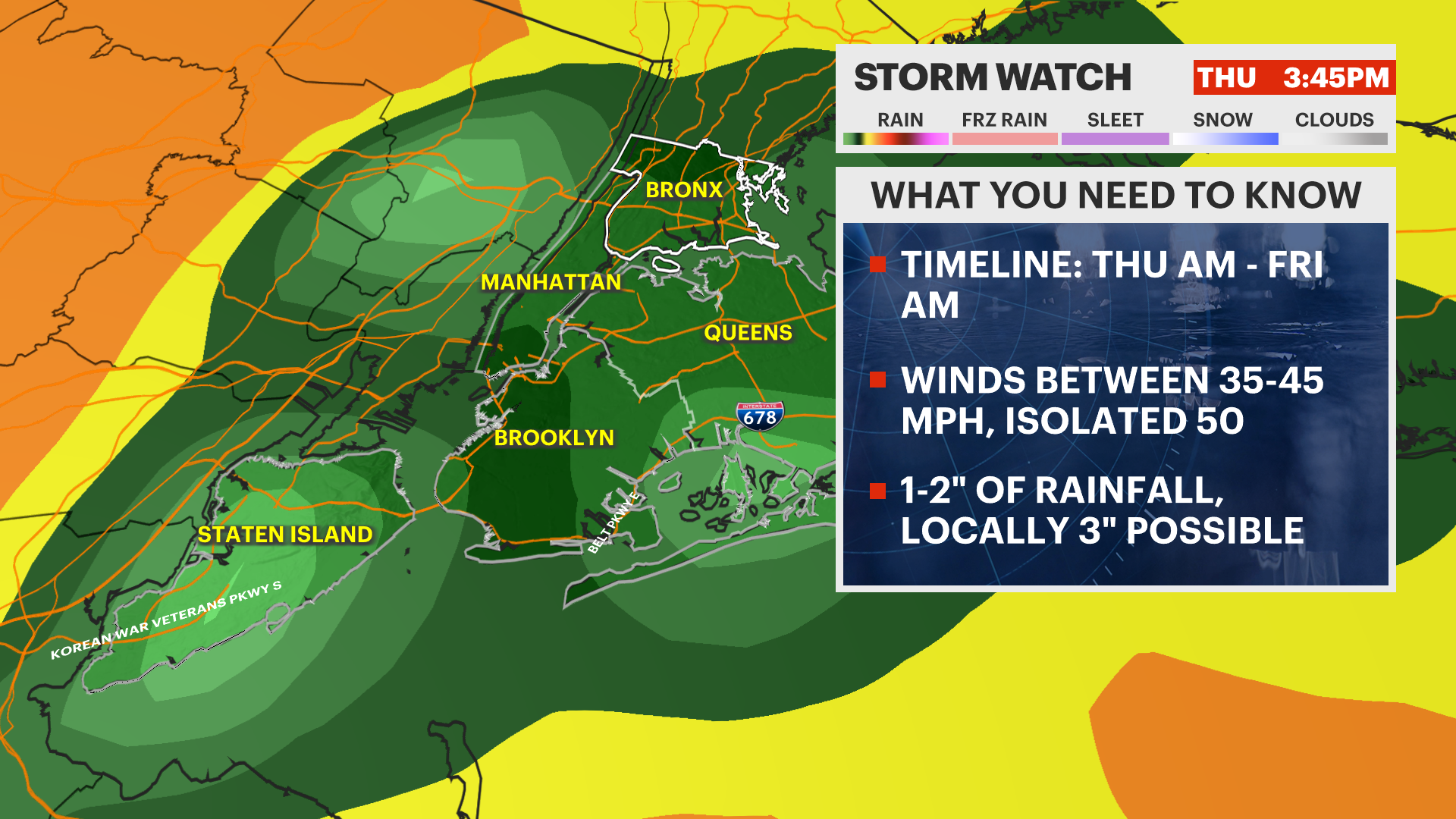 Thursday will be the main weather maker of the week. Widespread rain moves in early and continues through the day, with periods of heavy rainfall possible. We’ll get a break midday before a second round of rainfall moves in from 2 p.m. until about 9 p.m. Temperatures will hover in the low 60s, and winds could gust up to 40 mph at times.