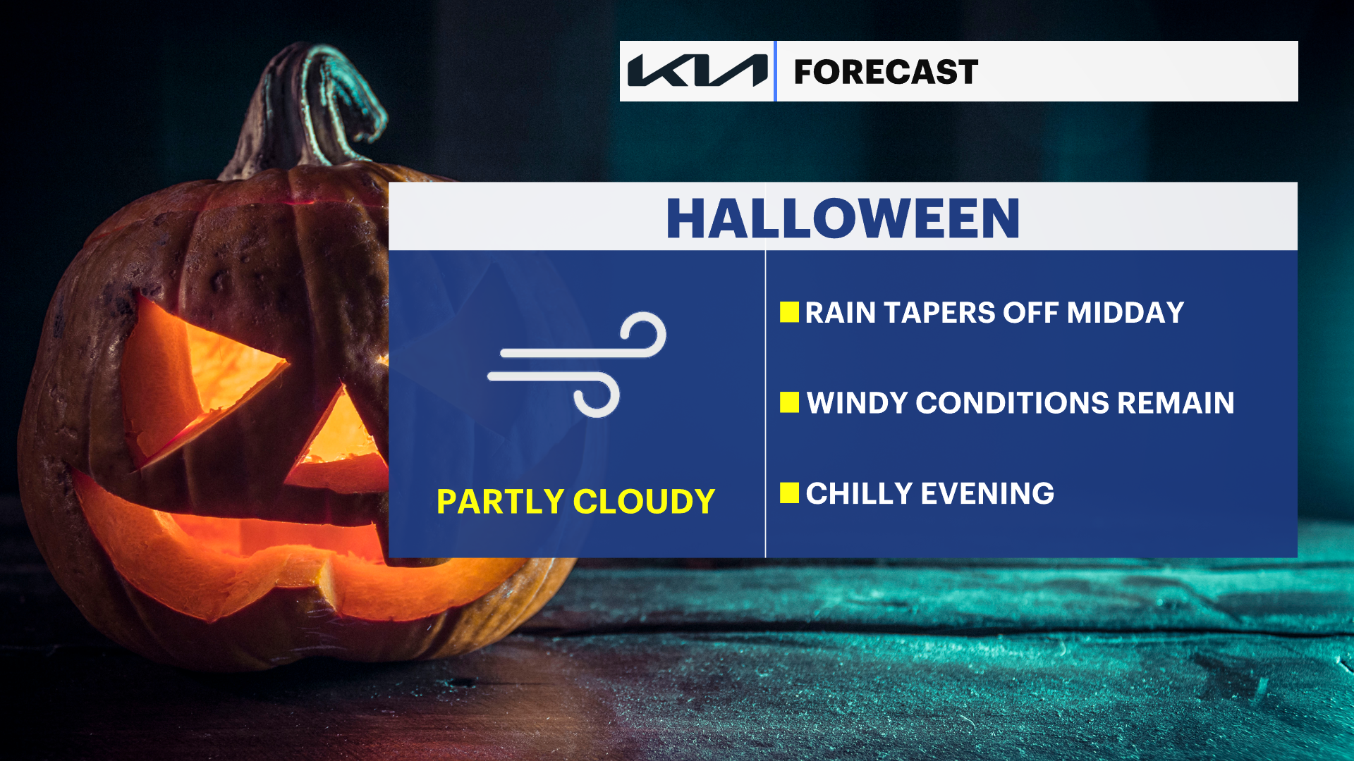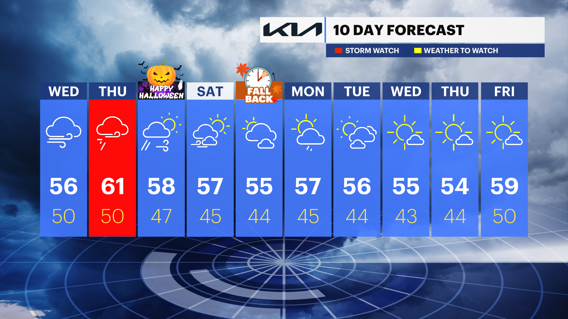 Friday (Halloween): Chance of morning breezy showers. Still cool with a gradual clearing sky. Gusty. Highs near 58. Lows near 47.