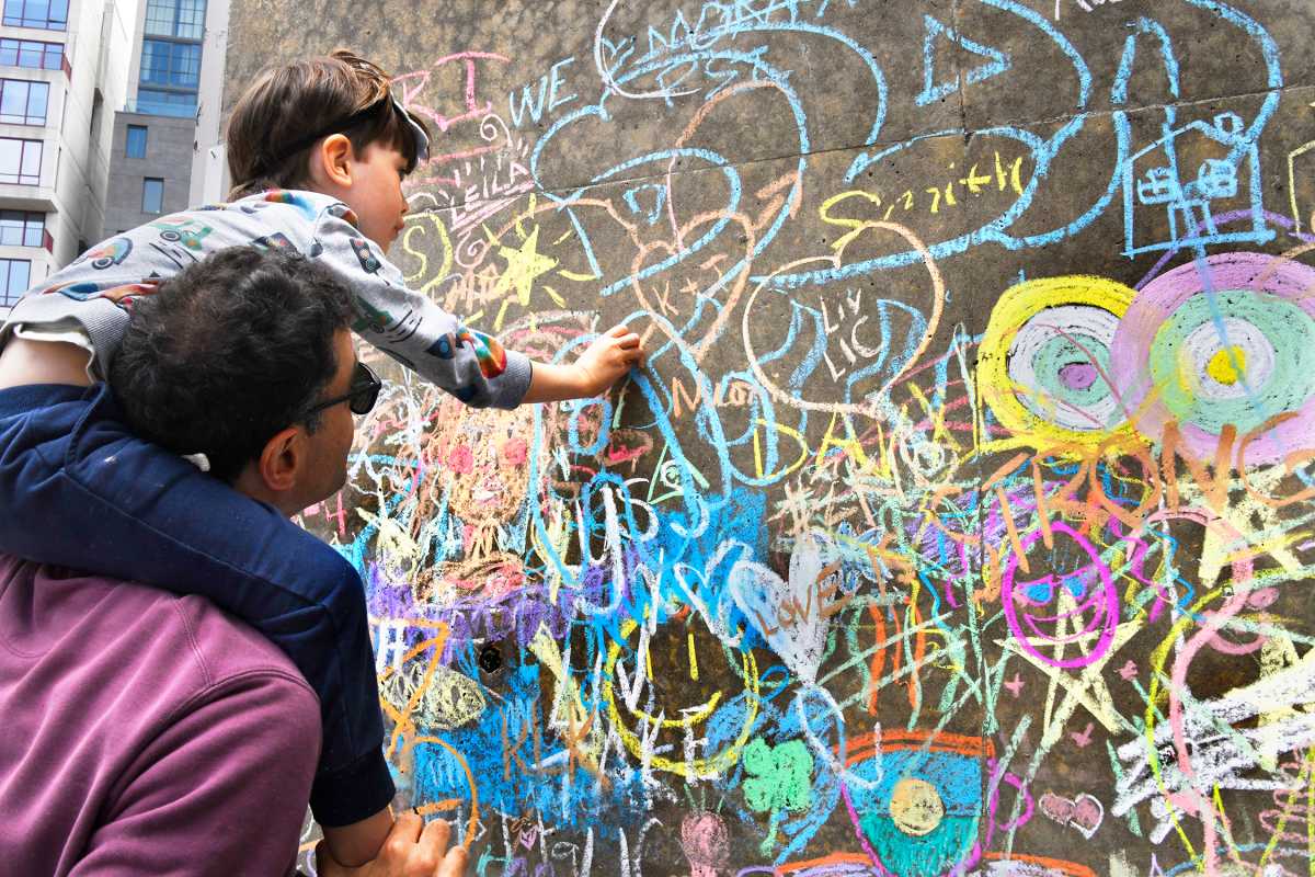 Also having fun were the multitudes of folks, including lots of kids, who grabbed chalk and added to the free-for-all art fest on the chalk wall.