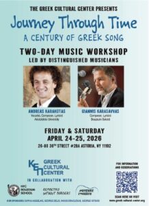 The Greek Cultural Center presents Journey Through Time, A Century of Greek Song, a two-day music workshop led by distinguished musicians Andreas Karakotas and Giannis Karasavvas. A few spots are still available. Workshop starts on Friday, April 24, from 6-10 pm and continues on Saturday, April 25, 10 am–2 pm. Lunch will be provided and workshop resumes at 3–7 pm.