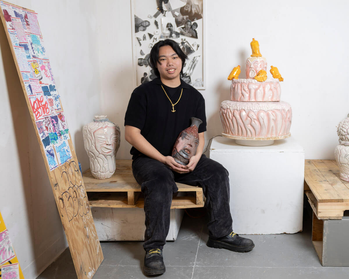 Despite being born and raised in Guam, and growing up Filipino and Thai, I’ve always lacked the space and voice to truly express myself within these communities. I use ceramic sculptures to claim and create a space for other people who feel rejected by their community. I point to the human figure in my sculptures through expressive faces to convey a multitude of emotions. I use animals from my homeland to create a parallel between their relationships within their ecosystems and my experiences within my society.