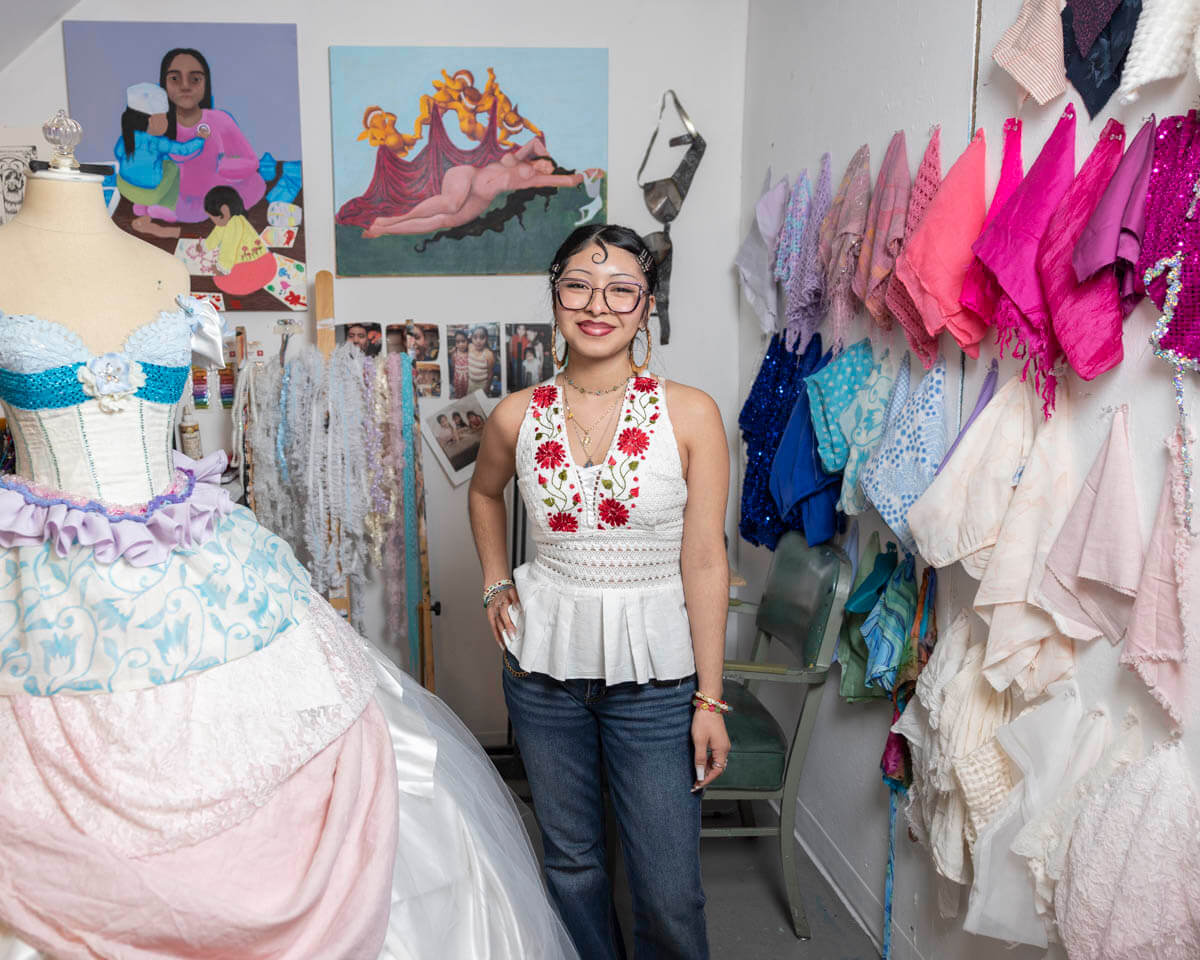 As a multidisciplinary artist, I create my artwork using various mediums, ranging across painting, screen printing, ceramics, fabric, and textile manipulation to create sculptural pieces. In the process of making my work, I use recycled fabric and materials to keep it sustainable and encourage this practice among others, communicating that art is accessible and relatable. Using anything, including old T-shirts, knitted scarfs, bed sheets, lace, sequin fabric, and discarded clothing scraps, I arrange my work to create a balance between texture and colors that complement each other, enhancing the properties of the material. Staying within the bounds of my Mexican culture, color is a prominent aspect that I focus on and portray in my work. The use of bright and striking colors in my choices of textiles also translates within my other mediums of work.