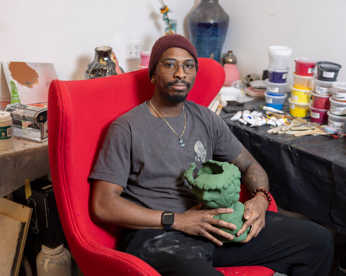 As a Black non-binary artist who finds community development and belonging through craft, I especially value clay. It’s a medium that always grounds my practice and body. As I’m using clay as a therapeutic practice, I feel this connection to the earth and the communities that I deeply care about nurturing. Slowing down, listening, and building relationships is what clay allows me to do. The sense of safety and familiarity is an invitation for viewers to use clay themselves through repetitions of patterns, shapes, textures, and colors. My vessels and sculptures are an open gesture to encourage others to imagine themselves working with clay, reconnect with their hands, find their own moments of grounding and belonging, as it’s a place of connections.