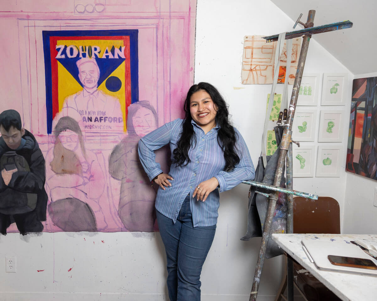 The thesis is composed of acrylic paintings on raw canvas, hung from the ceiling to create an installation—recreating the illusion of being on the train with the addition of recordings from train travels. Each panel tells its own story. One is her love story. Her first long-term relationship and support system for the past four years as their intimacy is shown in closeness and eye contact. Two, an ode to her CUNY education and current-day politics with a campaign poster and CUNY ad. Three, an homage to immigrants of New York City and the damaging government use of ICE in the country. Four, a family portrait celebrating her Mexican heritage and close familial relation.
