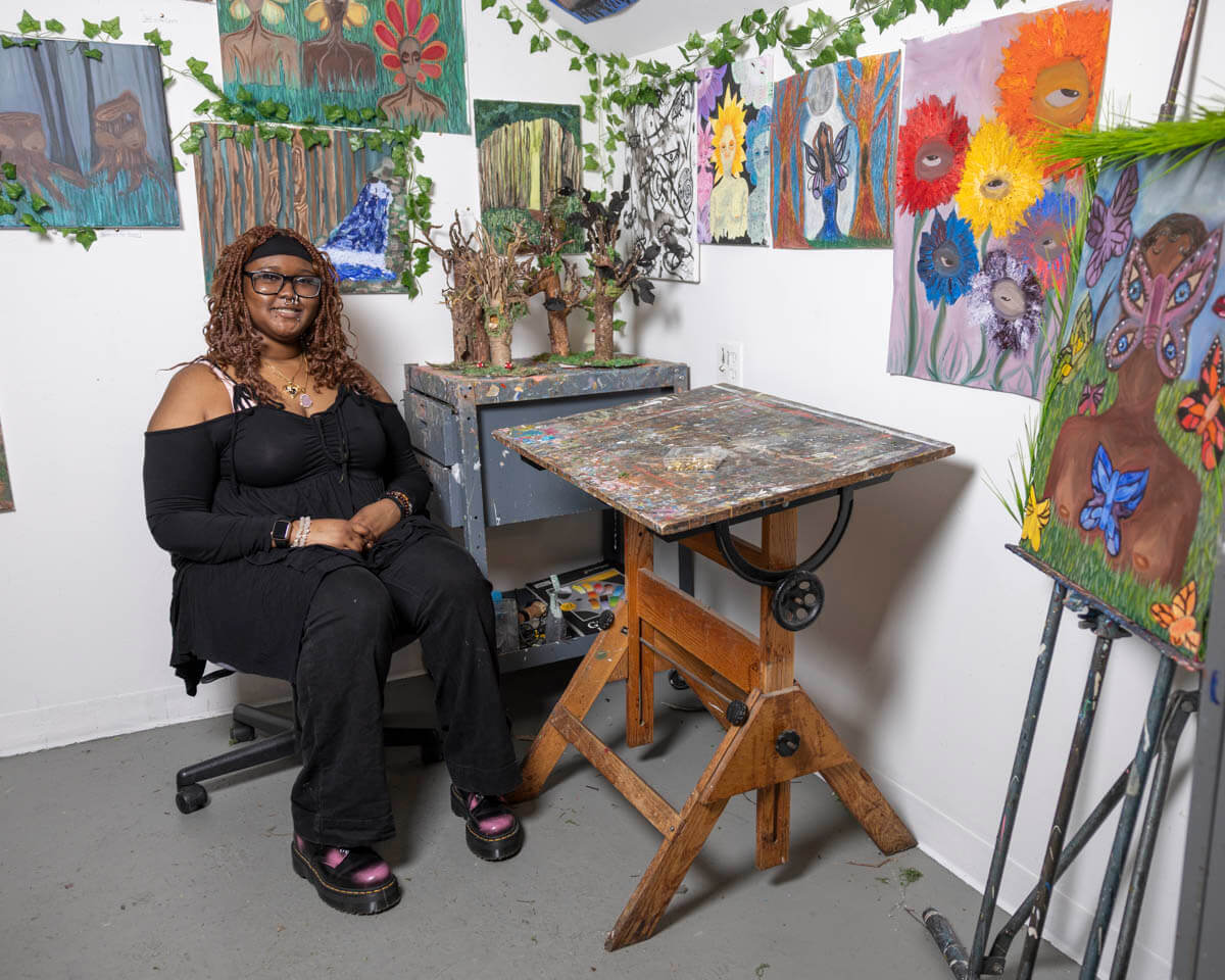 Working across oil painting, digital art, and textiles, I create layered compositions where color and form carry emotional weight. Thread-like lines bind forms across the surface, symbolizing relationships, care, and responsibility. Influenced by the vibrancy of Haitian and Yoruba visual culture, I use saturated color, patterned surfaces, and layered materials to reflect memory and cultural heritage. In one work, I reference The Breakfast Club, reimagining its iconic composition as a moment of emotional release and connection. The piece reflects vulnerability, identity, and the shared experience of being seen by those you love. In another, a wood panel painting depicts my childhood self transitioning into adulthood, beginning with myself, skateboarding into life. Titled Where Your Flowers Grow, the work explores growth, movement, and the passage of time, capturing the ongoing evolution of self within my environment and family structure.