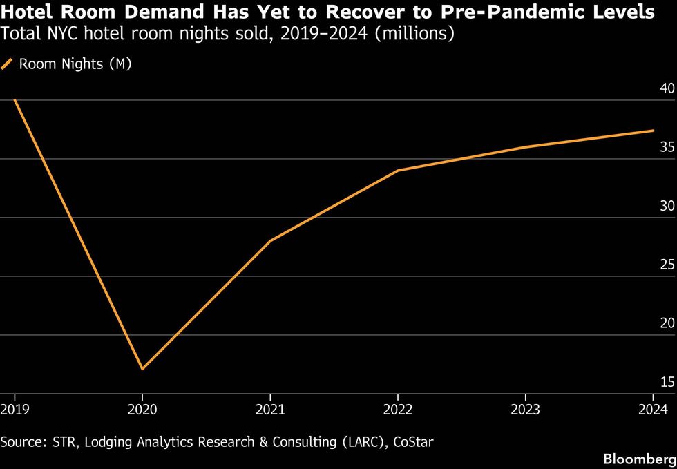 The stakes are especially high in New York, where hotels are still recovering from the pandemic, which slammed the industry and left the accommodations workforce about a quarter below pre-Covid levels. Room rate have climbed to nominal records but inflation-adjusted profitability remains well below the pre-pandemic peak, the Hotel Association of New York City said in a report from JLP+D.