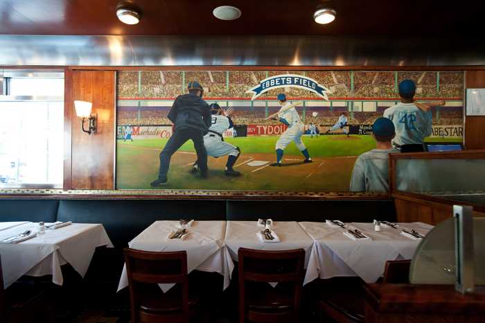 An Ebbets Field mural inside the Brooklyn Diner includes a long-debated inaccuracy, noted by longtime manager Alexis Reyes.Photo courtesy of the Fireman Hospitality Group