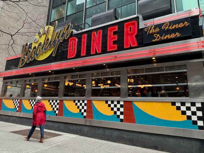 The Brooklyn Diner’s neon-lit exterior stands out along West 57th Street in Manhattan.Photo by Claude Solnik