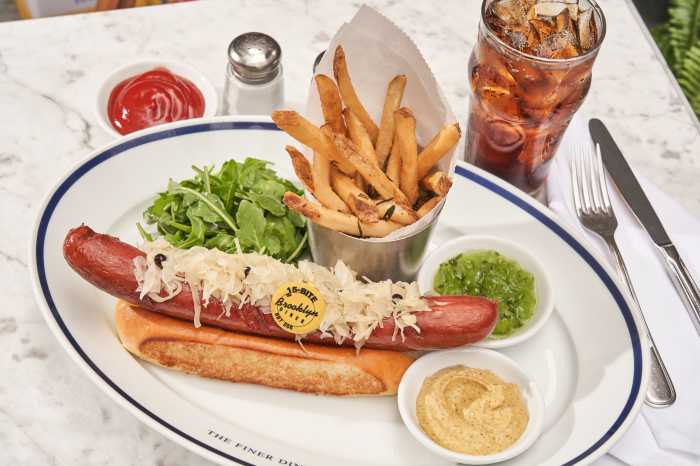 A New York-style hot dog is served at the Brooklyn Diner, known for its classic comfort food.Photo courtesy of the Fireman Hospitality Group