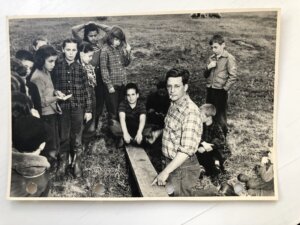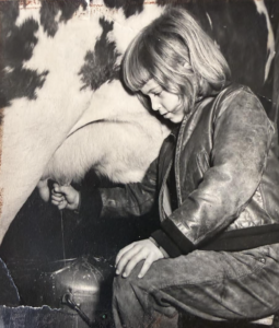 In 1951, we went on a trip to Otis, a farm in Massachusetts. We crossed over a gully or a stream on a log. I still have a photo of myself milking a cow into a metal bucket