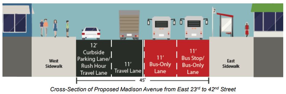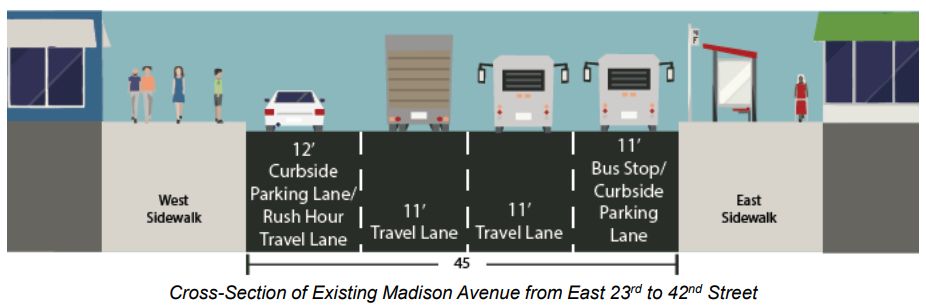 Madison Avenue currently has two bus lanes, two travel lanes and a parking lane between East 60th and East 42nd streets that serve 34 local and express bus routes, but the two bus lanes don’t extend below East 42nd Street.