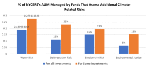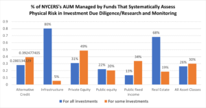 To further the System’s overall goal of reducing their carbon footprint, the Bureau of Asset Management also engaged with over 100 publicly traded portfolio companies in the System’s portfolio to encourage swift action that will position their company to meet our current moment and take advantage of growing opportunities in the clean energy sector. Two of the largest banks in the world disclosed their energy supply ratios and methodologies after reaching settlement with BERS. The majority of our public market managers have plans that are aligned with NYCERS’ net zero expectations. NYCERS also expanded its investments in clean energy and climate solutions.