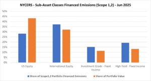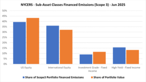 As of June 30, 2025, public equity and corporate bonds represent approximately 75% and 25% of the combined market value, with their contributions to Scope 3 financed emissions are 75% and 25%, respectively. U.S. equity has higher Scope 3 financed emissions but lower emissions intensity than international equity. Within corporate bonds, high yield has much higher financed emissions intensity and higher absolute financed emissions than investment grade corporate bonds.