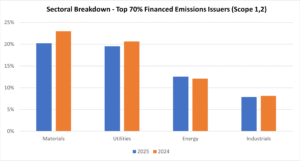 The Utilities and Materials sectors are the highest emitting sectors among the top 70% of Scope 1 and 2 financed emissions, representing 20% and 20% financed emissions of the group, respectively. This information continues to be critical to our engagement activities.