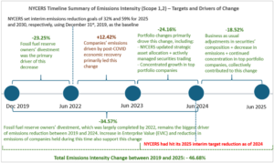 The emission intensity for NYCERS decreased during FY 2025, after surpassing the interim emission reduction target set for Jun 30, 2025. NYCERS’ Scope 1 and 2 financed emissions intensity decreased by 18.52% between Jun 30, 2024, and June 30, 2025, yielding a total reduction of 46.68% from the baseline of Dec 31, 2019. While we welcome this decrease in NYCERS’s portfolio’s footprint, it is important to understand and acknowledge the drivers of this change: most of this emission reduction is driven by portfolio and market changes (including changes in securities’ weight and increase in the valuation of companies) while actual company emission decreased as well. (See Section 1.2 for more detail on the attribution analysis.)