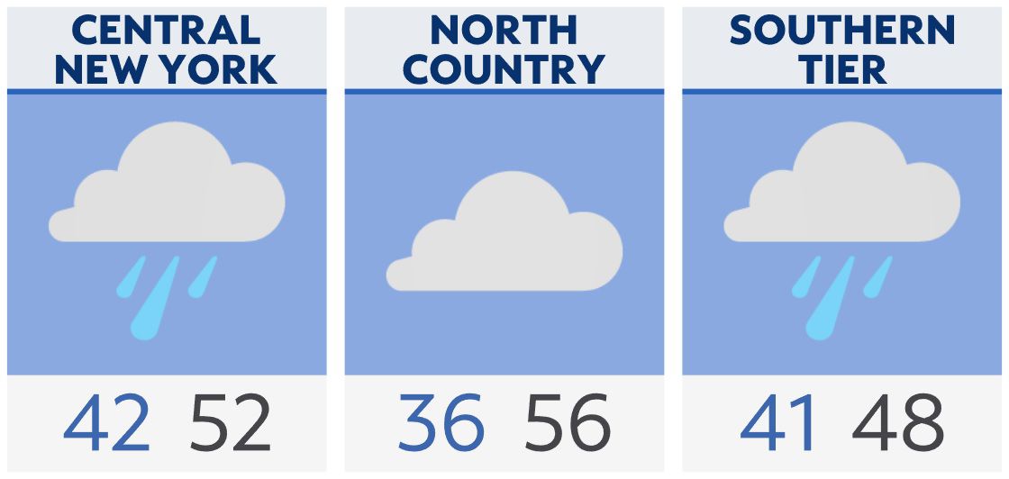 The rainiest weather looks to be around Central New York, the Finger Lakes and the Southern Tier. Drier and quieter weather will prevail across the North Country and Adirondacks.