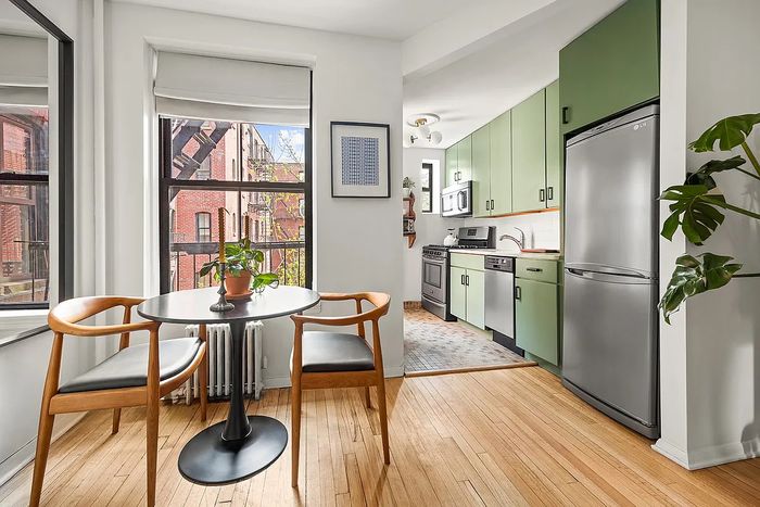 A one-bedroom co-op in a 1925 townhouse that’s a quick walk to Riverside Park. The living room has dark hardwood floors, a decorative fireplace, two north-facing windows, and striking floor-to-ceiling bookshelves. The renovated kitchen is an alcove shape, with subway tile, marble countertops, and stainless-steel appliances. The marble and subway-tile motif is echoed in the bathroom, which has also been updated. The bedroom has another north-facing window, room for a queen, and, per the listing, closets that “reflect a designer’s touch.” It’s a walkup, but the apartment is on the third floor — the upper limit of tolerable. Maintenance is $1,016 and covers a no-frills spread: laundry and bike storage. The location, however, has a few frills: nearby Riverside Park, easy access to the 1 and the many shops and restaurants on Broadway, and a great Housing Works location for buying up the neighborhood’s castoff wool blazers and Le Creusets.