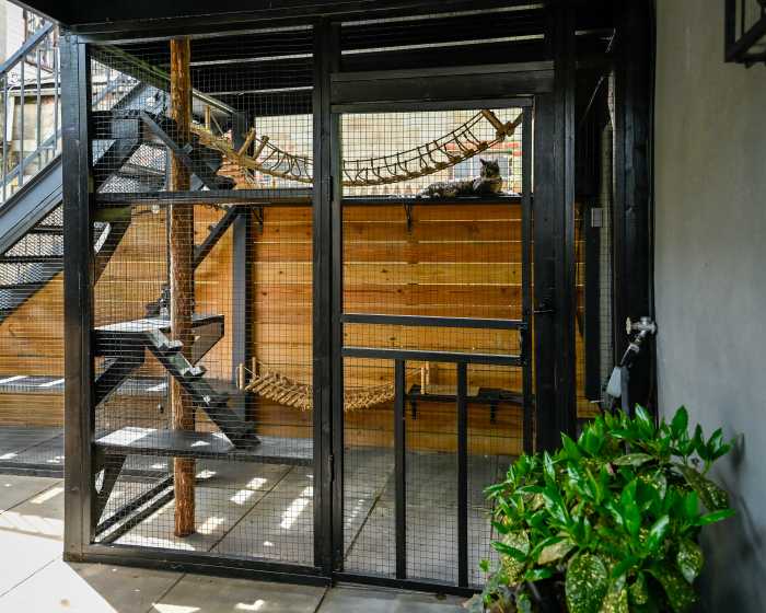 His cats access the enclosure through a pet door installed in a ground-floor window of his brownstone. The space includes bridges, towers, a scratching pole and benches large enough for McGehee to keep his felines company.