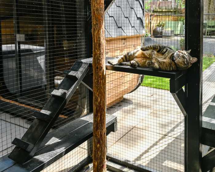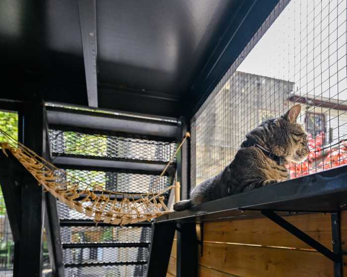 Custom-built catios start at $8,000 and can be tailored to fit any space, lifestyle and number of cats — one client has 19 mousers. The structures are made from weather-resistant materials such as pressure-treated lumber and cedar. Owners can choose from black vinyl mesh wire fencing, pet screens, galvanized steel fencing or black steel critter fencing, all designed to keep cats safe while protecting them from outside animals.