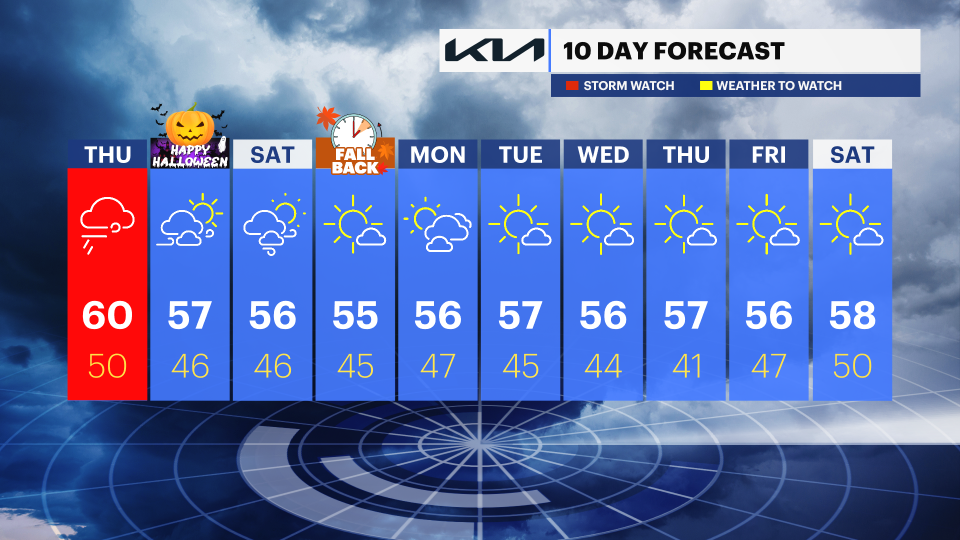Halloween will be drier but cool and windy, with gusts up to 40 mph and temperatures in the low 50s, which could make trick-or-treating feel a bit chilly. Temperatures will remain in the 50s with breezy conditions for both weekend days.