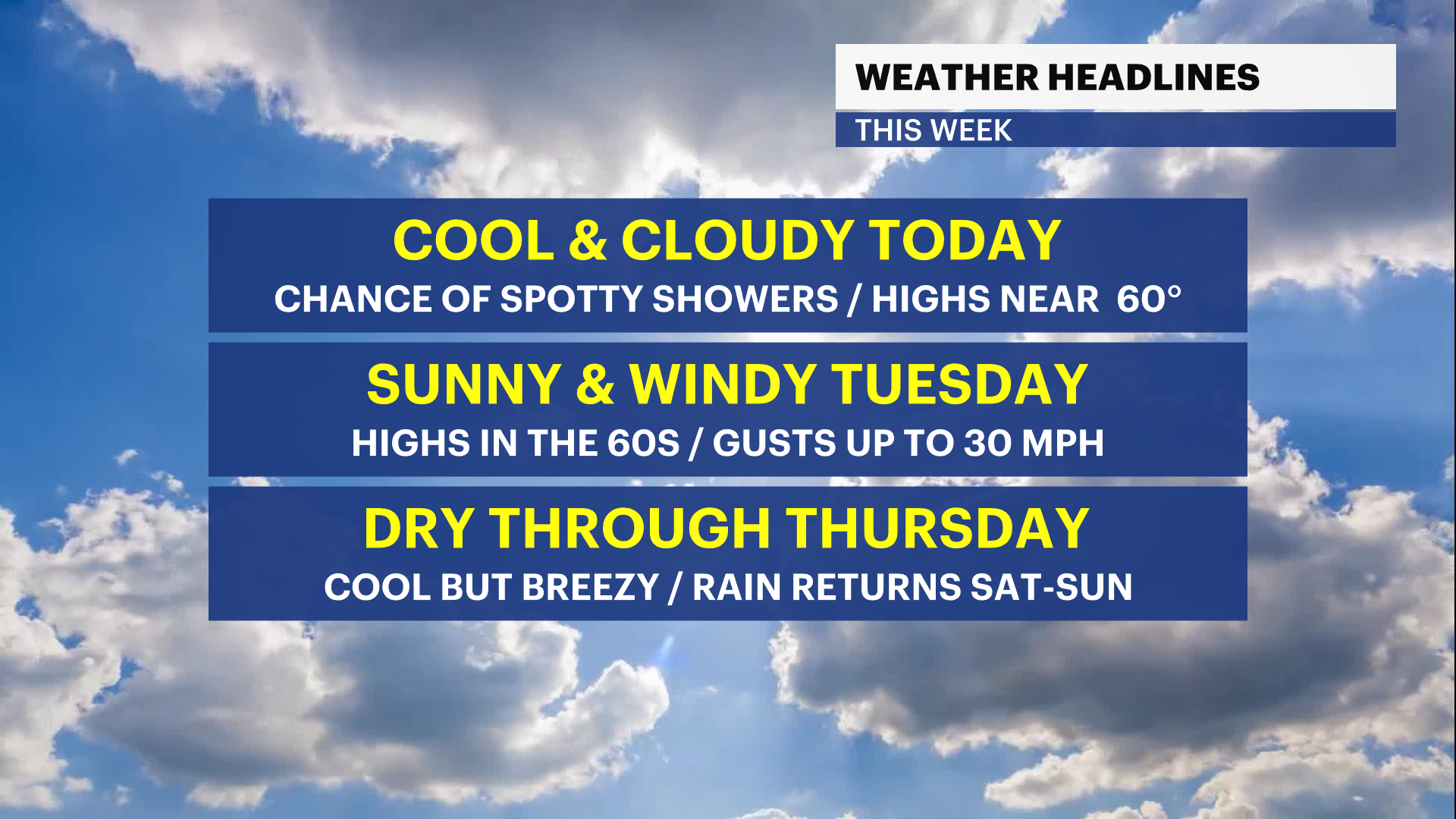 Today: Cloudy, cool with spotty showers. Highs near 59.