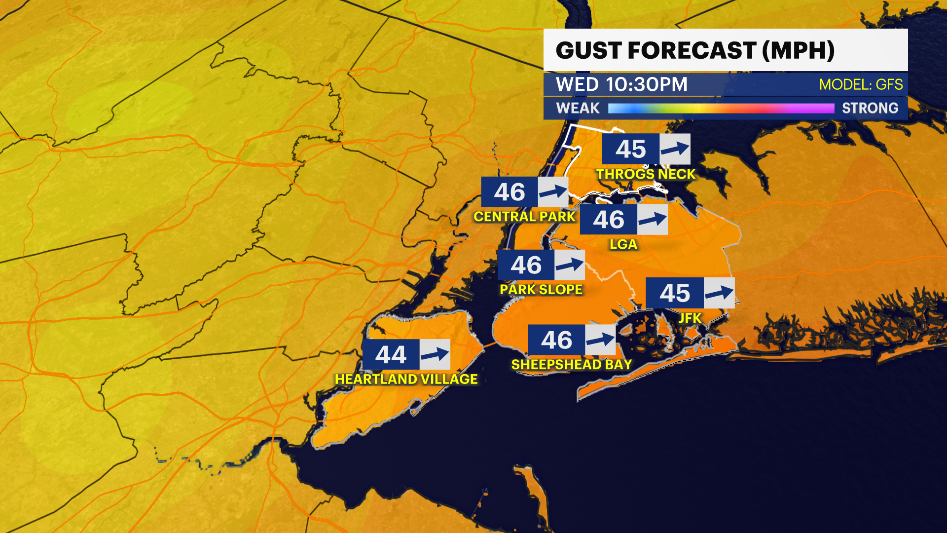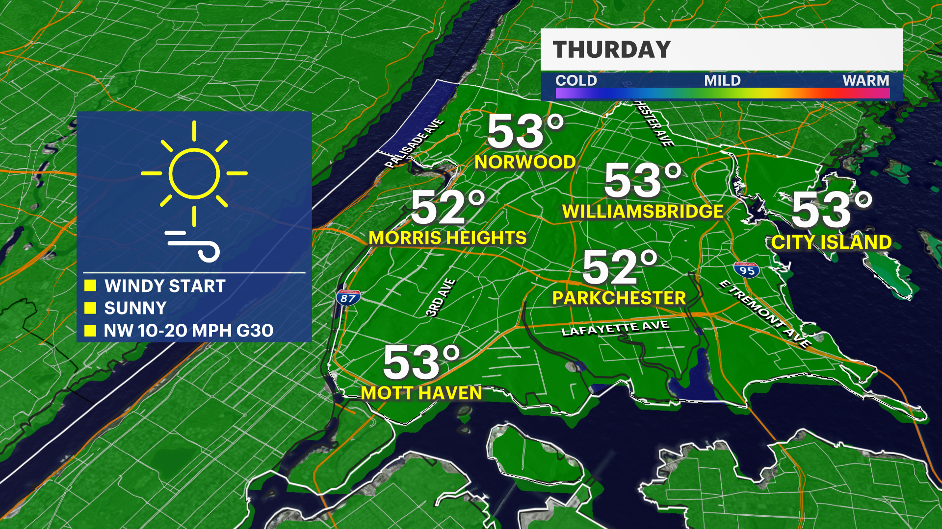 THURSDAY: Strong wind to start, improves by the afternoon. Highs in the low 50s, lows in the low 40s.