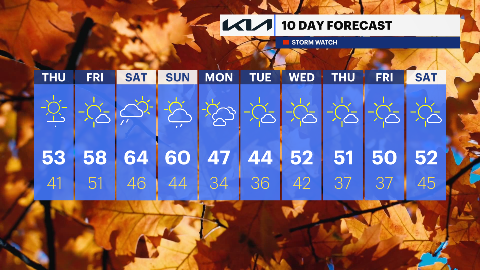 FRIDAY: Sun, clouds, and dry. Highs in the upper 50s, lows in the lower 50s.