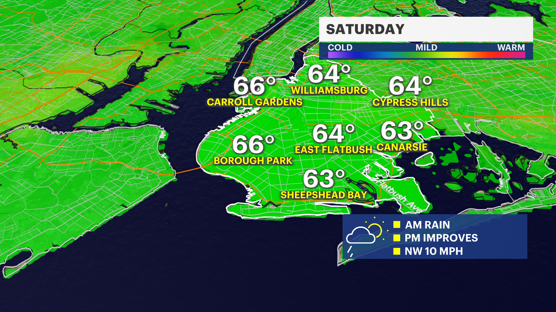 SATURDAY: Morning rain before dry conditions in the afternoon, with the possibility of a scattered shower in the afternoon or evening. Highs in the mid-60s. Lows in the upper 40s.