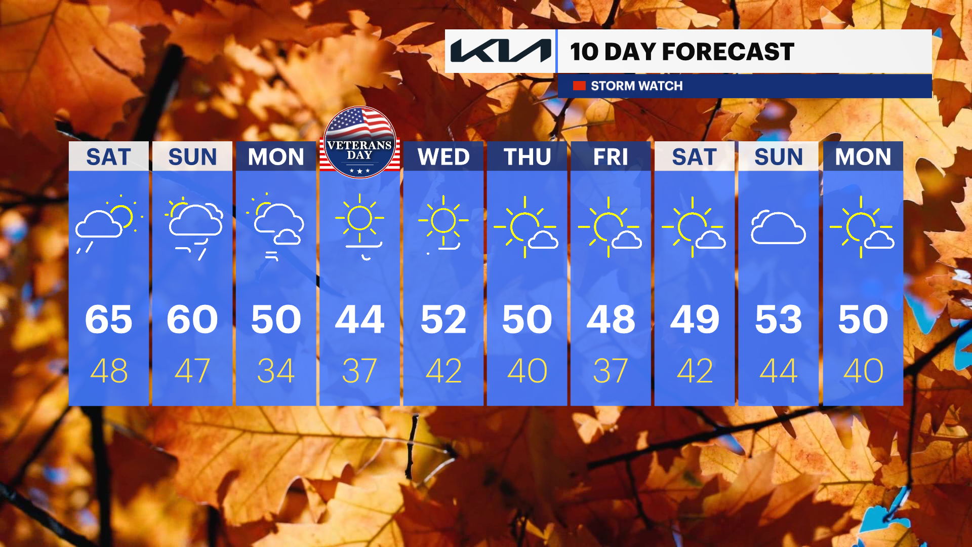 Cold air moves in for Monday and Tuesday, which is expected to be the coldest so far of the season. Temperatures at their coldest will be near freezing.