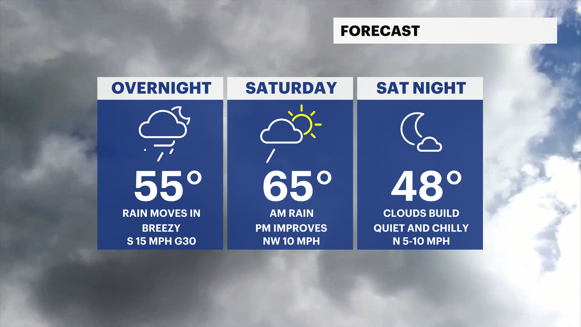 SUNDAY: Dry morning before rain in the afternoon hours. Rain expected to move in by lunchtime. Highs in the low 60s. Lows in the upper 40s.