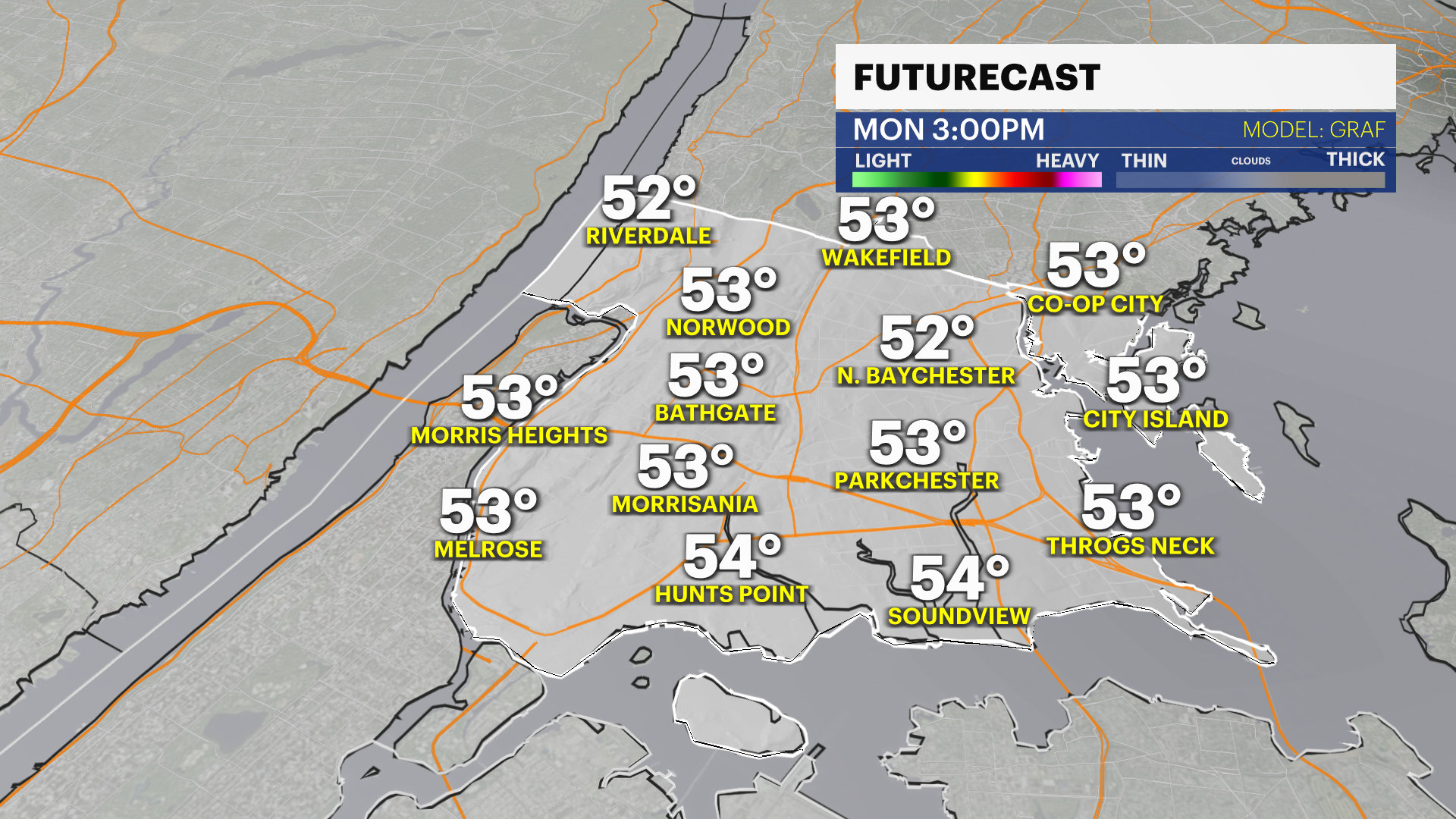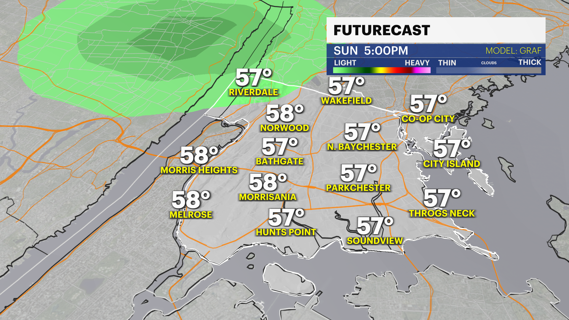 Grab the umbrella today. Stray showers are expected to pass through today, mainly after noontime. It’s a mild Sunday, just a few degrees lower than Saturday, which reached 65F at Central Park (Climate average is 57F). Showers will be spotty this afternoon through your night. Monday morning will be foggy with showers until around noon, then the sunshine will return. Temperatures will be in the 50s much of the day on Monday, but drop off quickly around 2-4 p.m. when our cold front passes.