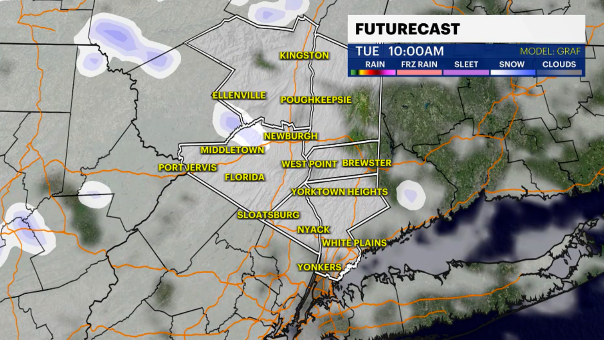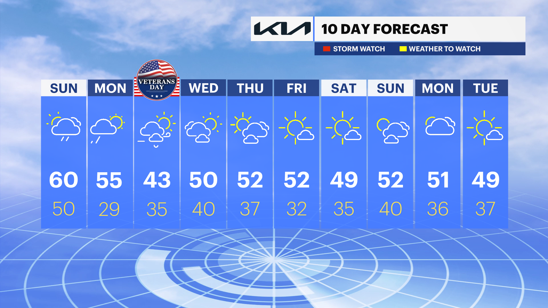 TUESDAY – VETERANS DAY: A more significant colder day under sunny skies. Highs near 43. Overnight lows 32.