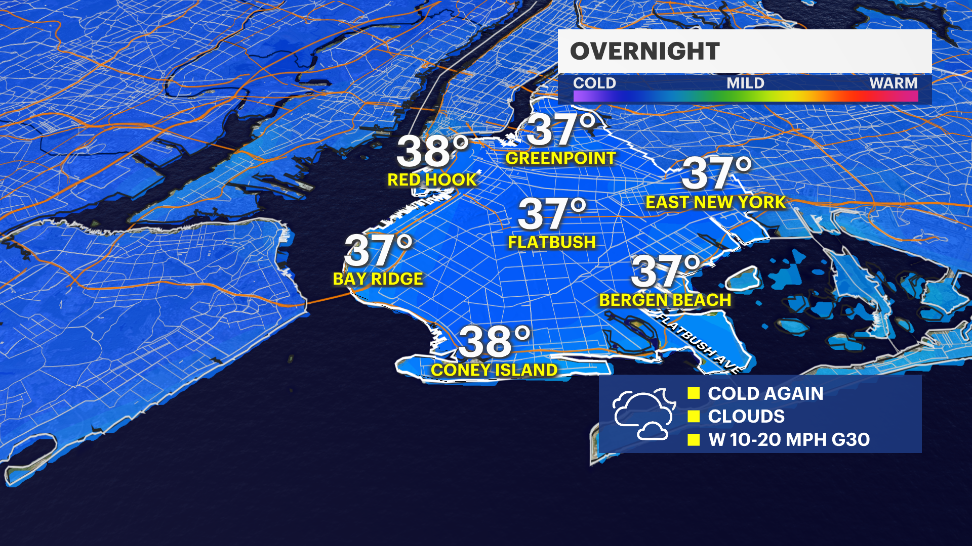 OVERNIGHT: Lows in the middle to higher 30s. Still windy, making it feel more like the 20s. Partly cloudy.