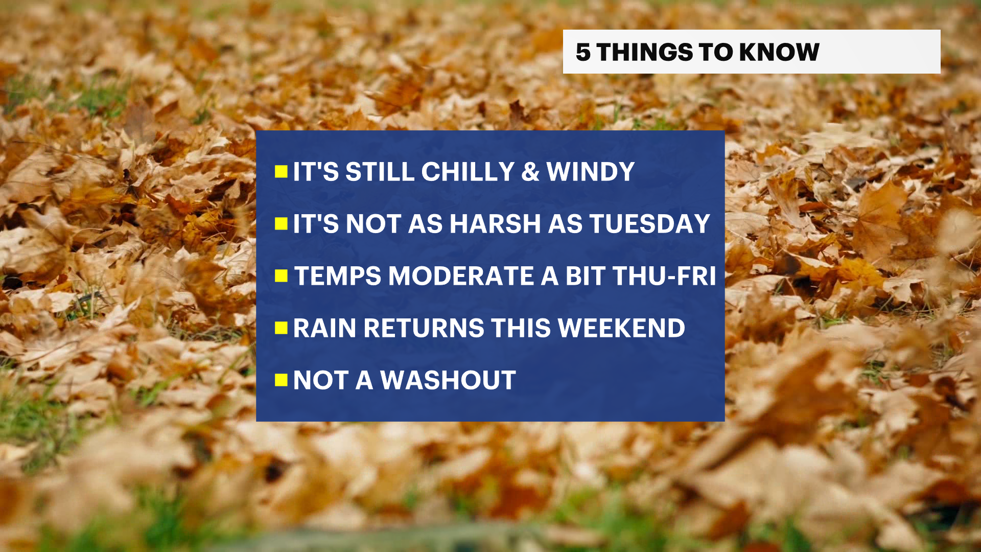 Clouds dominate our sky today with chilly temperatures in the upper-40s to low-50s and brisk winds gusting up to 30 mph. Feel-like temperatures will be in the low-40s.