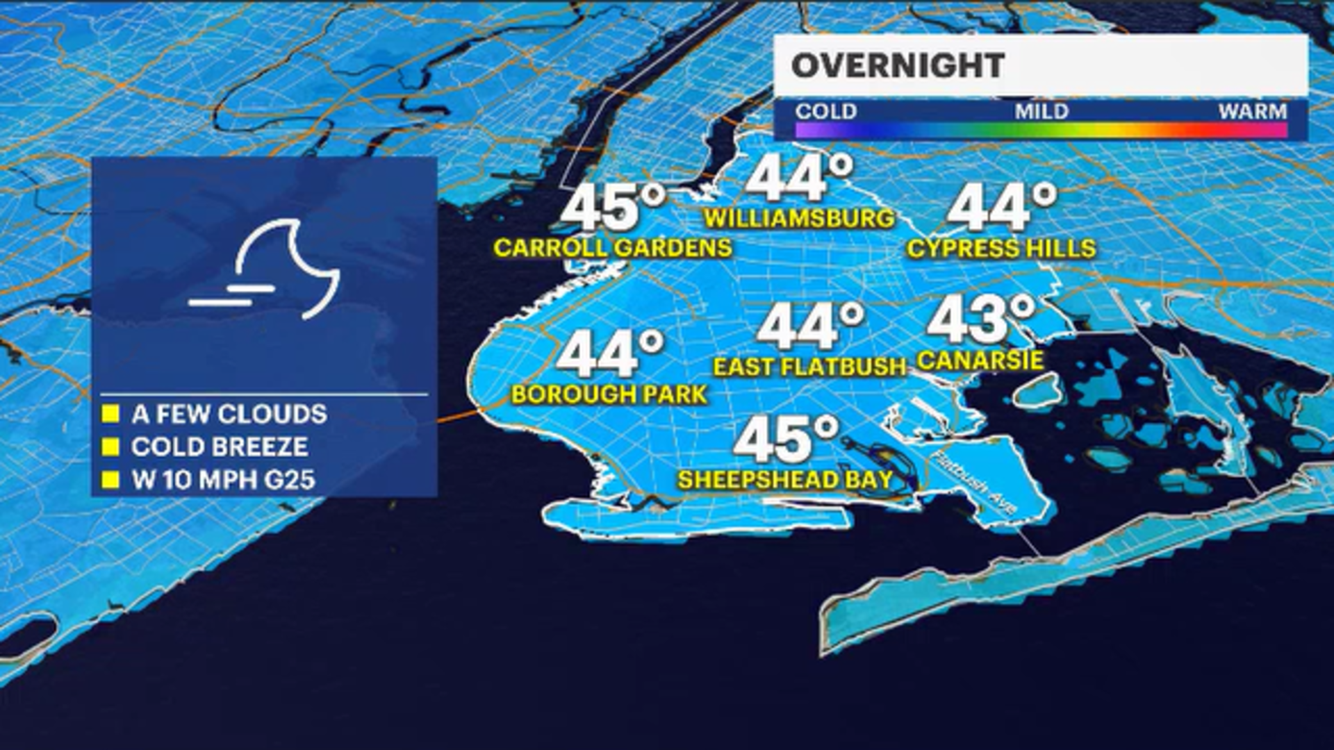 OVERNIGHT: A few clouds, not as cold and still breezy. Lows in the low 40s.