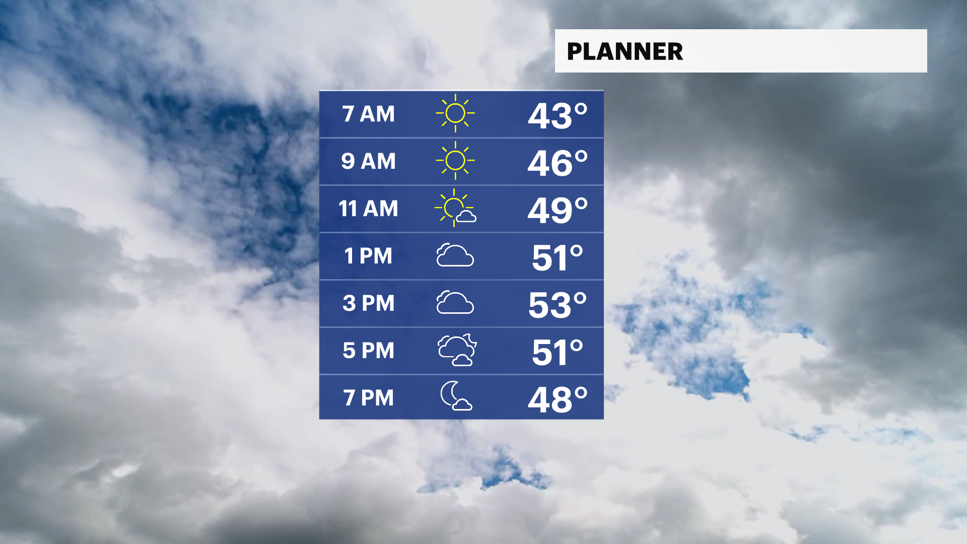 Thursday: Chilly, peeks of sun and light winds. Highs near 48. Lows near 39.