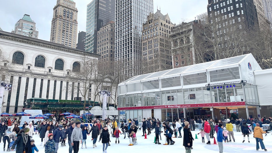New York City’s Bryant Park Winter Village has outdoor activities during the cold winter months such as a temporary ice skating rink, bumper cars on ice, a food market, and a bar called “The Lodge”. (Photo by: Deb Cohn-Orbach/UCG/Universal Images Gro