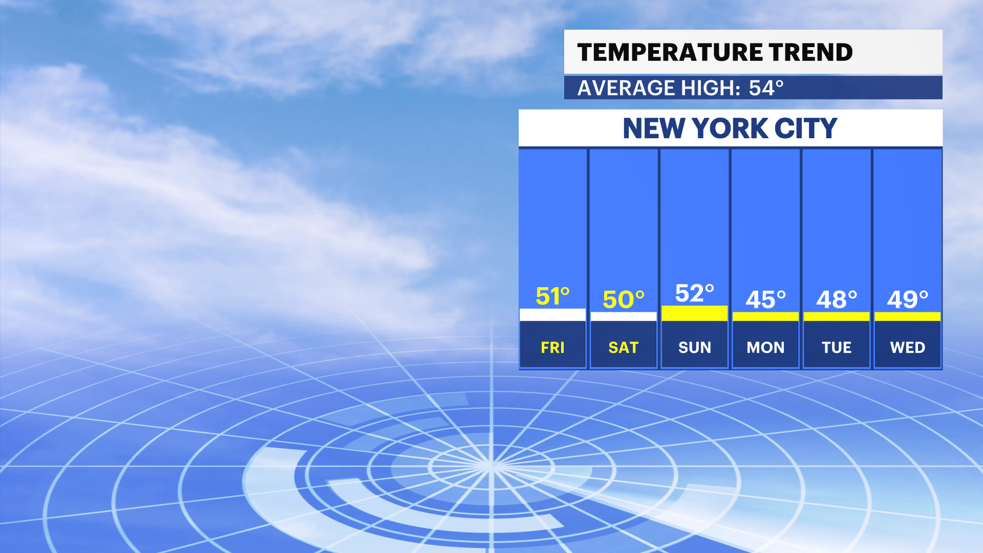 WEDNESDAY: Mostly sunny. High in the mid- to upper 40s. Lows in the low 30s.