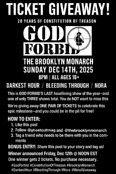 God Forbid is playing just three more shows in 2025! You can win a pair of tickets to their only headline show in December at The Brooklyn Monarch, here at Ghost Cult! The band is celebrating 20 years of their “Constitution Of Treason” album and the show also features Darkest Hour, Bleeding Through, with Nora, and takes place Sunday Dec 14th, 2025, at 8pm! This is also a rare, all-ages show for the band!
