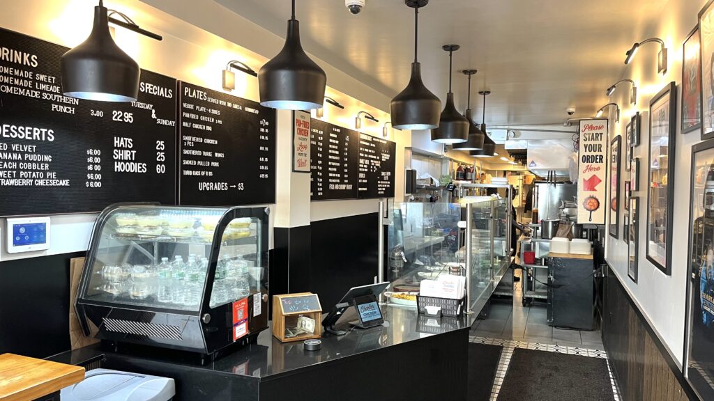Located about mid-block between Columbus and Amsterdam avenues, the UWS’s Charles Pan-Fried Chicken outpost is as narrow as it gets, with virtually no seating space. However, you can easily spot the kitchen behind the counter (in which all their famed side dishes are on display), and Eater confirmed the bird is pan-fried on site.