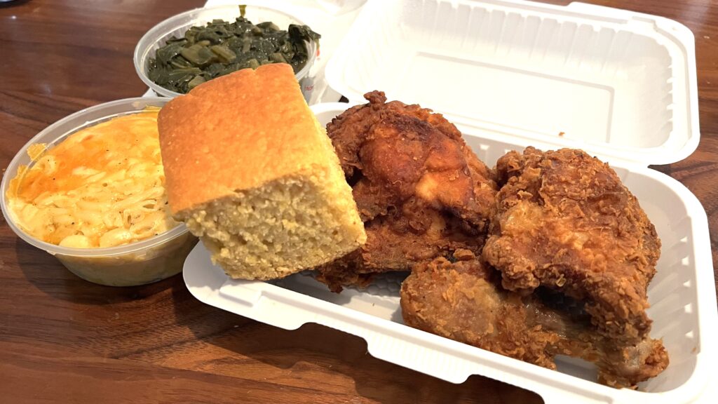 I opted for the classic Pan-Fried Chicken Plate, where three pieces (dark and/or white meat, your choice) come with two sides and one cornbread. The highly advertised, golden and creamy-looking mac and cheese was a no brainer, and I complemented it with collard greens. Lastly, as the ultimate test, I took my order home, a 15-minute bike ride on a cool (but not cold) mid-fall afternoon.