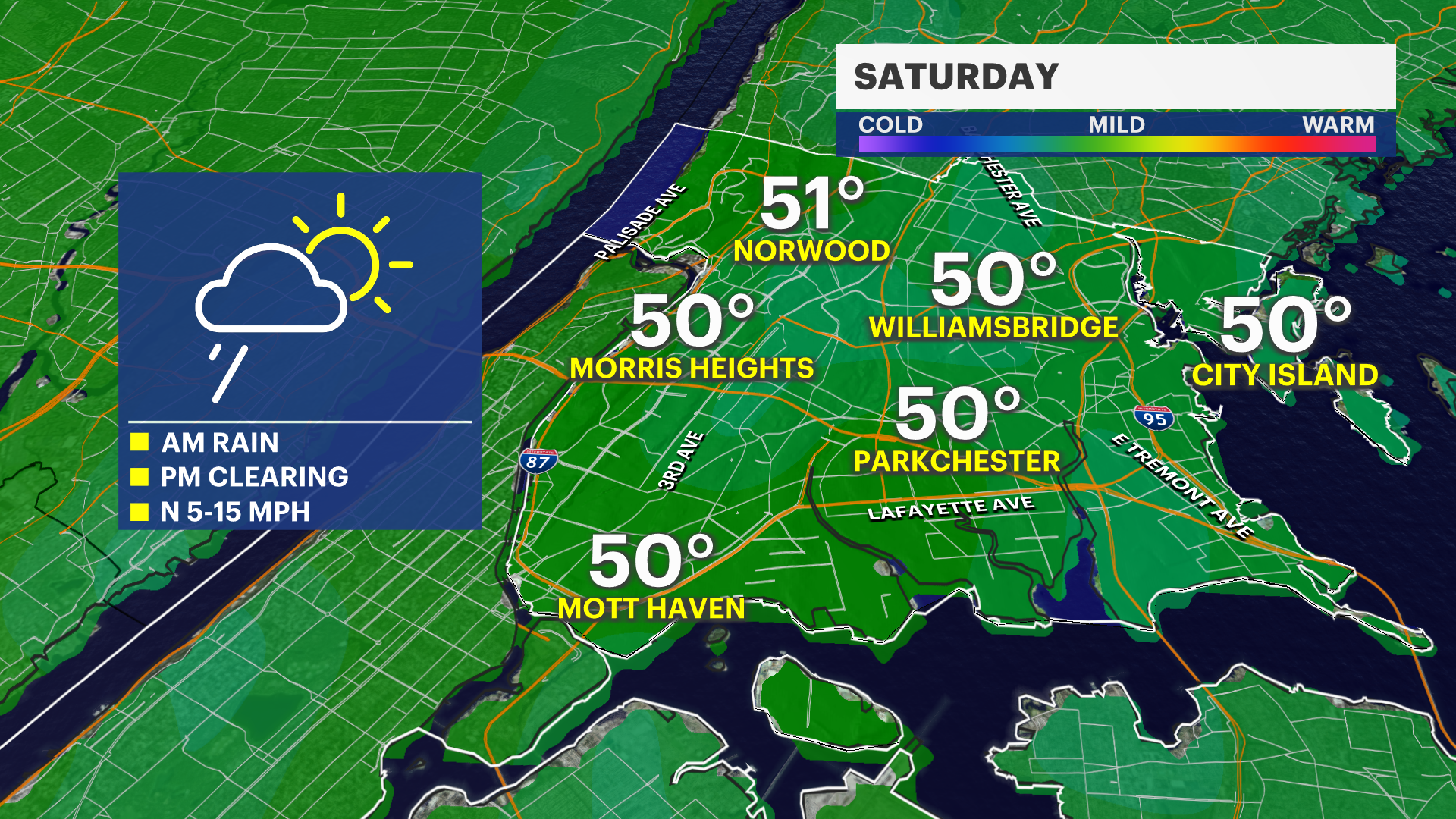 SATURDAY: Morning rain, evening clouds. Highs in the low 50s, lows in the low to mid-30s.